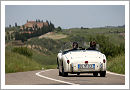 The last special stage of the day was a very special one indeed. Just before Buonconvento the cars took a small section on an unpaved road giving a small impression what racing was all about in the pre-war years. The next section might be the best known of the Mille Miglia: after driving to the Siena and Florence the road goes up to the mountains to the famous Passe della Futa and later the Radicosa. The Futa Pass is one of the main crowd puller of the entire MM and the drive up there is very much a carnival, the visitors arrive early in the morning or even the day before with their camper to secure the best spots in the serpentines and the crowd is sitting on the nature tribune just under the pass plate to encourage the passing cars. This is also the most dangerous part of the Mille Miglia as the accompanying cars and the numerous motor bikes are encouraged as well with the spectators and some of them drive well above their limits. But this year the inevitable annual rain shower started exactly when the first cars came up the pass so at least less motor bikes could be seen that day. After the short shower the sun was out again to give the warm afternoon light on the way to Bologna, Modena and back to the arrival in Brescia.