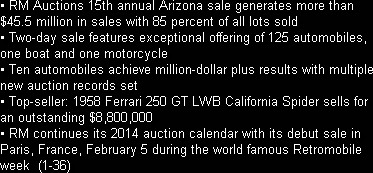 RM Auctions, the world’s largest collector car auction house for investment-quality automobiles, kicked off its 2014 auction season on a fantastic note once again this week, realizing an impressive $45,563,450 million in sales* with 85 percent of all lots sold at its 15th annual Phoenix, Arizona sale.
