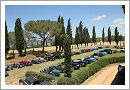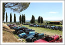 Highlight of the day was the lunch break in the estate of Col d´Orcia. In the huge park there was enough space so that the cars could be parked in a very loose allocation instead of a strict line-up. Due to the heat the places in the shadow where preferred by the first ones to arrive. The buffet lunch was taken at a very long impressive table in the shade of Tuscan cypresses. After tasting the local food and wine the crews enjoyed some more miles before arriving back in the Bugatti village.