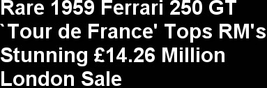 Continuing a six-year track record of achieving fantastic results, RM Auctions’ annual Battersea sale generated an incredible £14,266,030* ($23,039,638 USD)** in sales with an impressive 84 percent of total lots sold before a packed house in central London this week (31 October). The top performer of the evening sale was the simply beautiful and extraordinarily rare 1959 Ferrari 250 GT LWB Berlinetta ‘Tour de France’, which attracted spirited bidding from eager collectors, selling for a strong £1,960,000.