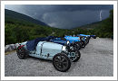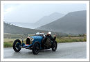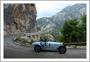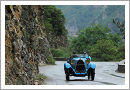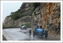 Again in perfect sunshine the Bugatti left Gréoux-les-Bains to the east passing the nearby Lac d´Esparron to follow the Verdon towards the Lac de Sainte-Croix and the Gorge du Verdon. After the coffee break along the road the journey led upwards to the Corniche Sublime with the lunch stop. Situated on top of the gorge the restaurant and the road to and from the stop gave spectacular sights over the gorge and the surrounding area. Unfortunately during the lunch one could see the bad weather coming towards the gorge and although impressive to see the thunder and lightning coming from the dark clouds did not promise any good for the afternoon. After lunch all the participants were eager to leave to run away from the expected showers but as the weather was faster the afternoon became very wet. What started with torrential rain showers soon became a hailstorm where the cars had to hide under trees and small bridges to avoid damage. Although the rain weakened later on the rain clothes were needed the entire afternoon, especially as the grand prix cars lacking cycle wings led the drivers in a constant spray. But as one could see passing them by it did not really spoil the mood and latest in the evening at the restaurant with a good glass of local wine the rain was just another episode to be told at home.
