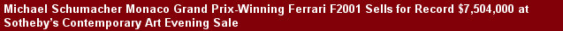 Michael Schumacher Monaco Grand Prix-Winning Ferrari F2001 Sells for Record $7,504,000 at Sotheby’s Contemporary Art Evening Sale