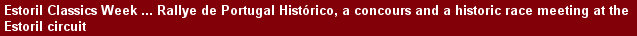 The Estoril Classics Week comprised of three main elements, the Rallye de Portugal Histórico, a concours and a historic race meeting at the Estoril circuit. The Rallye de Portugal Histórico featured an international entry list of 87 teams, of which 15 were from Portugal and 72 from a wide range of other countries, including in alphabetical order, Andorra, Belgium, Canada, France, Italy, Lithuania, Monaco, Russia, Spain, Sweden, Switzerland and the United Kingdom. The rally had started at the Estoril Casino on 02 October and took competitors through Figueira da Foz, Braga, Viseu, Sintra and concluded at the Estoril circuit on Saturday the 6th, with a pair of slalom stages on the main pit straight. It also featured demonstration runs by former rally stars Stig Blomqvist and Miki Biasion in a Group B Audi Quattro and Lancia Delta Integrale respectively.