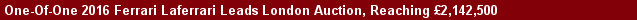 The 2016 Ferrari LaFerrari, finished in an exquisite one-of-one special order livery of Vinaccia paint over Pelle Chiodi Di Garofano interior, sold for £2,142,500. A star of the legendary hypercar trio that set the standard for high performance and high technology motoring in the last decade, this LaFerrari has covered just 918 miles, boasts a documented service history by authorized Ferrari dealers, and is accompanied by fitted luggage, manuals, and toolkit.