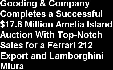 Gooding & Company, the world's leading auction house for collectors of rare and exceptional cars, achieved more than $17.8 Million in sales at its second-annual Amelia Island Auction on Friday, March 11, an 11% increase since last year in its new Southern Atlantic auction market. Among the 85 top-quality and rare automotive and motorcycle consignments presented (two lots were withdrawn prior to auction), 70 lots sold to a domestic and international clientele of discerning collectors, resulting in a strong auction sales rate of 82%.