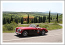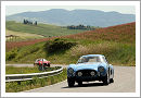The last special stage of the day was a very special one indeed. Just before Buonconvento the cars took a small section on an unpaved road giving a small impression what racing was all about in the pre-war years. The next section might be the best known of the Mille Miglia: after driving to the Siena and Florence the road goes up to the mountains to the famous Passe della Futa and later the Radicosa. The Futa Pass is one of the main crowd puller of the entire MM and the drive up there is very much a carnival, the visitors arrive early in the morning or even the day before with their camper to secure the best spots in the serpentines and the crowd is sitting on the nature tribune just under the pass plate to encourage the passing cars. This is also the most dangerous part of the Mille Miglia as the accompanying cars and the numerous motor bikes are encouraged as well with the spectators and some of them drive well above their limits. But this year the inevitable annual rain shower started exactly when the first cars came up the pass so at least less motor bikes could be seen that day. After the short shower the sun was out again to give the warm afternoon light on the way to Bologna, Modena and back to the arrival in Brescia.