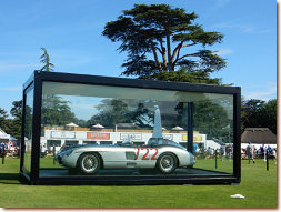 Mercedes-Benz 300 SLR in a glass enclosure on the cricket pitch, surrounded by obelisks where visitors