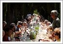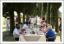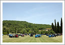 Highlight of the day was the lunch break in the estate of Col d´Orcia. In the huge park there was enough space so that the cars could be parked in a very loose allocation instead of a strict line-up. Due to the heat the places in the shadow where preferred by the first ones to arrive. The buffet lunch was taken at a very long impressive table in the shade of Tuscan cypresses. After tasting the local food and wine the crews enjoyed some more miles before arriving back in the Bugatti village.