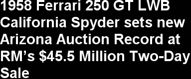 Within a beautiful setting and stunning presentation at the Arizona Biltmore Resort & Spa, the results represent a new high for the international auction house in Arizona. The two-day sale saw ten million-dollar-plus transactions and numerous auction records set, headlined by the top-selling 1958 Ferrari 250 GT LWB California Spider. Reflecting RM’s international clientele and the global appeal of the well-established event, bidders hailed from 20 countries around the world.