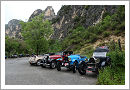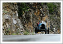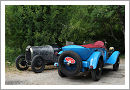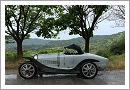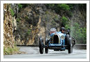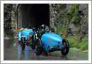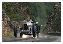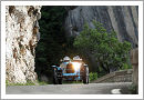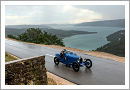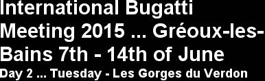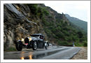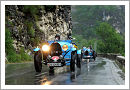Again in perfect sunshine the Bugatti left Gréoux-les-Bains to the east passing the nearby Lac d´Esparron to follow the Verdon towards the Lac de Sainte-Croix and the Gorge du Verdon. After the coffee break along the road the journey led upwards to the Corniche Sublime with the lunch stop. Situated on top of the gorge the restaurant and the road to and from the stop gave spectacular sights over the gorge and the surrounding area. Unfortunately during the lunch one could see the bad weather coming towards the gorge and although impressive to see the thunder and lightning coming from the dark clouds did not promise any good for the afternoon. After lunch all the participants were eager to leave to run away from the expected showers but as the weather was faster the afternoon became very wet. What started with torrential rain showers soon became a hailstorm where the cars had to hide under trees and small bridges to avoid damage. Although the rain weakened later on the rain clothes were needed the entire afternoon, especially as the grand prix cars lacking cycle wings led the drivers in a constant spray. But as one could see passing them by it did not really spoil the mood and latest in the evening at the restaurant with a good glass of local wine the rain was just another episode to be told at home.