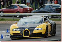 The Lamborghini displays, mainly around the historic aircraft on the opposite side of the clubhouse, were also very large and varied, with predominantly modern examples in a variety of lurid colours including an orange with gold accents Aventador LP760-4 by Oakley design. There were also a selection of earlier models, including a pair of Silhouettes, an Urraco, Countachs and an Islero S. Maserati was also well represented again by mainly modern variants of the marque, and finished in more sombre hues than their compatriots from Sant’Agata. Fronting the clubhouse in the main paddock area was the Barkaways Ferrari display, which featured a current restoration project of a Ferrari 275 GTB as a bare chassis/body unit. Amongst the cars in and around the paddock area were a pair of Ferrari 458 Speciale Apertas, one in metallic yellow and the other in metallic red, a LaFerrari also in metallic red, Alfa Romeo 4C and 8C plus a classic 1900 SS Coupe,  a De Tomaso Panera and a very rare Moretti 850 Coupe, to name but a few. There were also some non Italian “interlopers”, including a Ford GT, a McLaren, a Noble and a wild Bugatti Veyron finished in bare black carbon fibre and yellow by Oakley Design, which was also run on the test track. This car featured in the May 2016 edition of the magazine, and was excused for its inclusion as non Italian, on the basis that Ettore Bugatti was born in Italy and that the Bugatti EB110s were built in Modena, actually Campogalliano, during the late eighties and early nineties. Sounds like a good enough reason to include a unique bespoke supercar with so much presence.