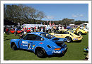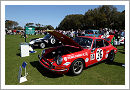 Just over the bridge on the other side of the lake was the first of the featured classes, the 50th anniversary class of the Ford GT40, the most successful American race car with four successive victories in Le Mans. After the decision was made to re-enter in the international racing scene and a failed purchase of Ferrari Ford set up an own race department with the intention to beat the European sports cars on their home territory. The formation of the Ford Advanced Vehicles department (FAV) in Slough (GB) started the development of the GT40 based on the experience of the Ford powered Lola GT, experienced team manager John Wyer of Aston Martin fame was running the race program. The first prototypes featured a 4.2 litre engine but the first season was not successful at all. A lack of experience and problems with the Colotti gear box and the front aerodynamics prevented good results, twelve of these prototypes were built including 4 roadsters. Both a closed and an open version of these could be seen in Amelia this year, Chassis GT/104 that came third in the Daytona 2000 Kilometres 1965 when its sister car won the first race for the GT40 and the first of the Roadster (GT/108) that served as a development car when the prototypes were worked over in the winter of 1964/65 by Carroll Shelby. The result was the new series model (known as the MKI) featuring a 4.7 Litre engine, a revised body and a ZF gearbox, at the same time a big block version (the 7,4-Litre MKII) was developed to replace the smaller engined cars at the end of the season. In Le Mans 1965 the entered factory cars including two new MKII failed again to finish when the above mentioned Ferrari 250 LM took the last of Ferraris victories, in 1966 finally the MKII finished development to gain the intended victory for the American company. An armada of no less than 8 MKII (Start Number 1-8) with heavily works supported private teams resulting in a 1-2-3 finish, the number 3 car shown in Amelia was entered by Alan Mann but failed to finish.
