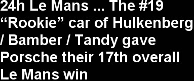 A second safety car period didn’t work well for Audi, and allowed the # 17 Porsche to establish a lead of around a minute in the 4th hour. As the race approached quarter distance, the Audis began to haul the Porsches back in, but the # 17 Porsche held on to the lead. Porsche had a fright in the 8th hour when Romain Dumas in the # 18 car went straight on at the end of the Mulsanne Straight due to a brake problem, but little damage was done and he only dropped one place. The same thing happened to Neel Jani some hours later, in the same place, dropping the car further out of contention. Porsche had a further blip in the game plan, when the # 17 car had to serve a 1 minute stop-go penalty in the 9th hour for an earlier “Slow Zone” infringement, which handed the lead to the sister # 19 “Rookie” car of Hulkenberg / Bamber / Tandy, the first two drivers having had no previous Le Mans race experience. Once this car was at the head of the field it didn’t look back, and stayed ahead of its sister cars through the night, when it showed better speed, and right through until 3.00pm on Sunday afternoon when it was the first across the line, which gave Porsche their 17th overall Le Mans win. The sister # 17 car of Webber / Hartley / Bernhard took the runner-up spot, a lap down on the winning car