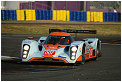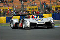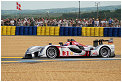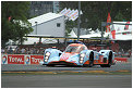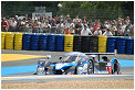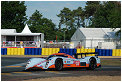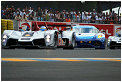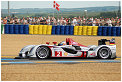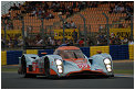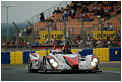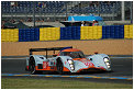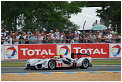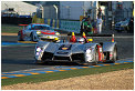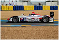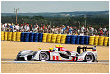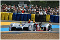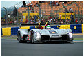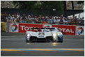 The race started promptly with a rolling start at 15.00 on a very hot (28degC) Saturday afternoon, and to the delight of a large partisan crowd the pole sitting # 8 Peugeot went into an immediate lead, and started to pull away from the pursuing # 1 Audi. There was even greater delight and a tremendous roar, when the # 7 Peugeot passed the Audi to take 2nd place. The GT1 Lamborghini, lasted only one lap before retiring with engine maladies pictures of that in action are going to be rare, whilst the JetAlliance Aston Martin went into the pits at the end of lap 1 with electrical problems, rejoining after a lengthy stop. Towards the front of the field the # 3 Audi driven by Alexandre Prémat was in trouble after only nine minutes, when he went off and hit the tyre wall at Indianapolis, returning to the pits after extrication from the gravel trap. Peugeot encountered a problem after 45 minutes, at the first round of pit stops, when their # 7 car was released into the path of the # 17 Pescarolo entered example, the two colliding, puncturing the rear tyre of the # 7 car, which had to do a complete lap, while the tyre flailed the bodywork to shreds around the track, necessitating the deployment of the safety car whilst the debris was removed. Upon eventually returning to the pits, the team changed the turbo, the FAP particle filter and oil radiator, and rebuilt the left rear corner of the car, all in around 20 minutes. Not long after it was Audis turn again or damage problems, when the # 1 car had to pit for a new nose after hitting somebody or something!