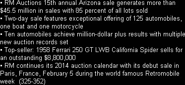 RM Auctions, the world’s largest collector car auction house for investment-quality automobiles, kicked off its 2014 auction season on a fantastic note once again this week, realizing an impressive $45,563,450 million in sales* with 85 percent of all lots sold at its 15th annual Phoenix, Arizona sale.