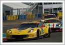 The GT classes saw a sprint like battle for supremacy from the start, and were closely bunched for much of the early part of the race, especially after the early safety car periods drew them all back together again. In the LMGTE Pro class almost every car suffered from some problems, some more serious than others, and the only car that had a relatively trouble-free run was the one that collected the victors laurels at the end. This was the # 64 Corvette C7.R of Gavin/Milner/Taylor, which, although it was the slowest class qualifier, was slugging it out with the # 51 AF Corse Ferrari 458 GT2 of Bruni / Fisichella / Vilander, which suffered a gearbox problem whilst leading the Corvette with 2 hours remaining. This necessitated a lengthy pit stop, and dropped it to 3rd place behind the sister # 71 AF Corse entry of Calado / Rigon / Beretta, which finished 2nd to the Corvette, despite having lost 4 laps earlier in the race, when it needed a new alternator. The LMGTE Pro Aston Martins had even more problems than the Ferraris, with the # 95 example of Sorensen / Thim / Nygaard the first to hit problems with power steering failure, which lost it a lot of time whilst the mechanics effected repairs. Then, during the night the # 97 “art car” lost an oil line when it was bounced too hard over the kerbs, sending it into retirement, and the pole sitting # 99 example had a collision with a LMP2 car, which put it back in the pits for repairs, and out of contention for a decent finishing position. The # 95 car survived to finish 4th in class, and the # 99 car managed to come home 6th in class.
