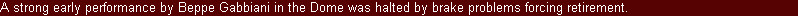 A strong early performance by Beppe Gabbiani in the Dome was halted by brake problems forcing retirement.