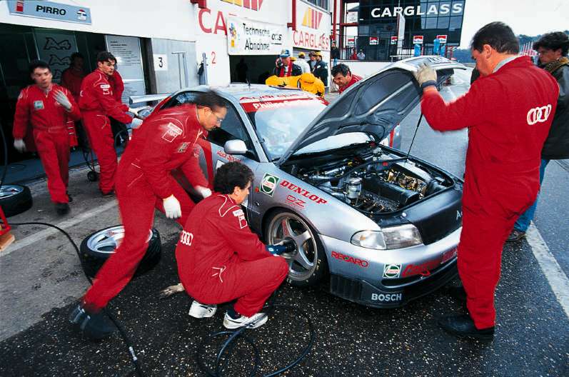 Weil Tankstopps und Reifenwechsel im STW-Cup verboten sind, kommen die Fahrer während des Rennens nur dann an die Box, wenn ein Defekt vorliegt. Die Szene auf dem Foto zeigt Routinearbeit während des Trainings.